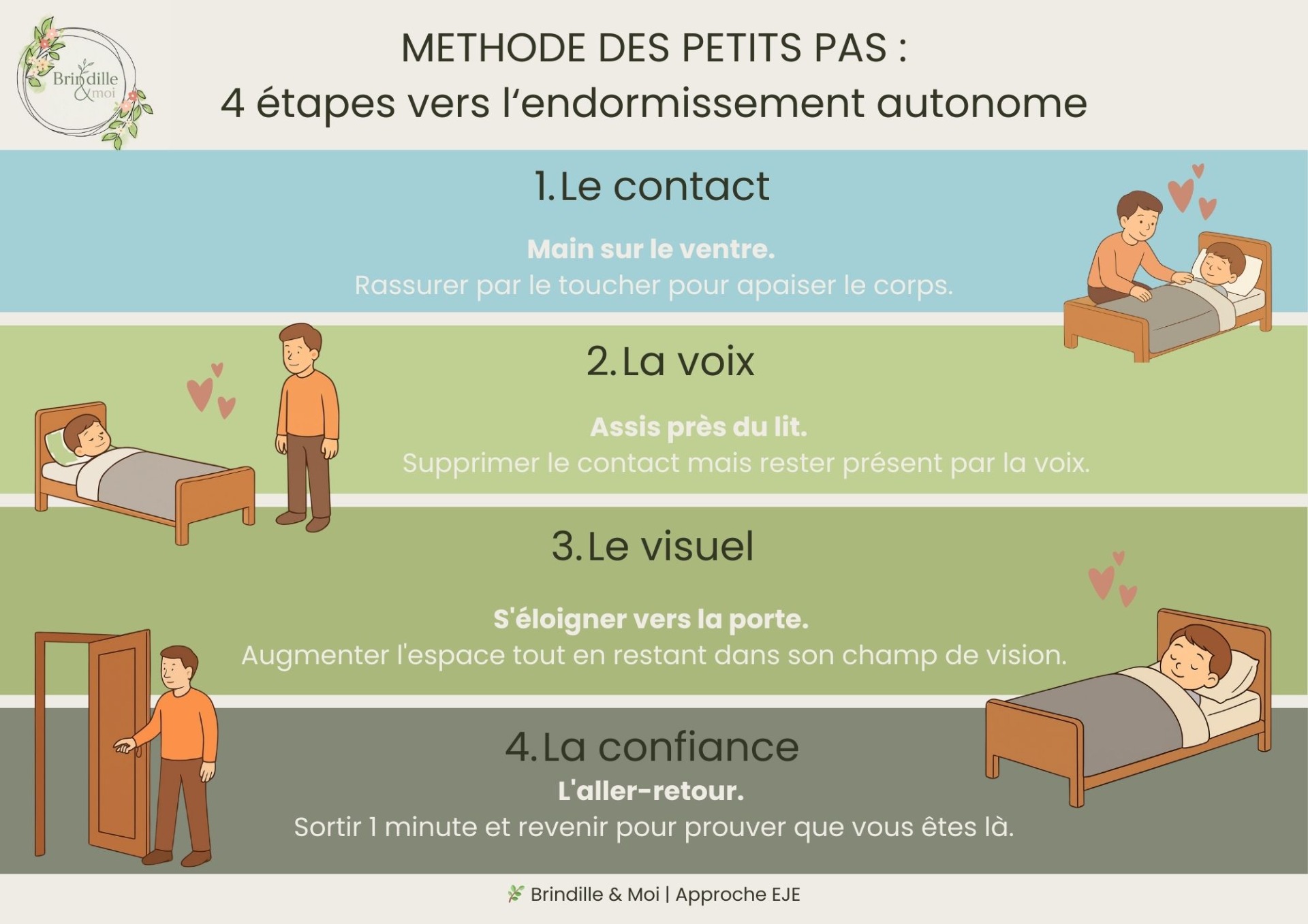 Conseil image : Un schéma simple illustrant les 4 étapes du retrait progressif. SEO Image : "etapes-endormissement-autonome-methode-douce"